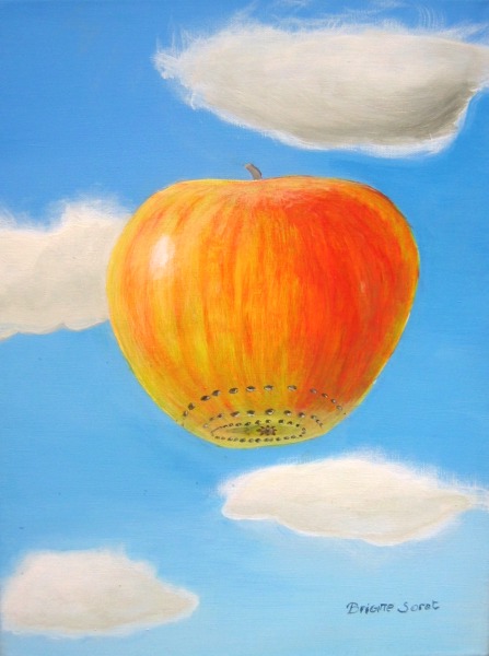 Bon, histoire donc de faire quelque chose avec cet essai r�ussi de ciel nuageux, et de profiter d'un cours "sp�cial pommes" du samedi apr�s-midi, Brigitte imagine d'y poser une pomme, fa�on Magritte. Avouons qu'en premier lieu, et � cause de ce nuage particuli�rement gris du haut, elle avait pens� un moment d'y faire flotter une douchette... et puis voil�, �clair de g�nie : |