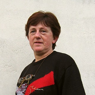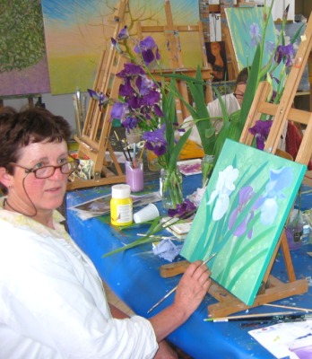 Odile et sa peinture d'Iris, pour le festival du Chateau d'Auvers sur Oise, mai 2006 (Voir la page)