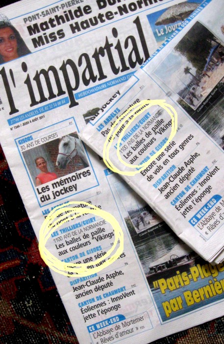 "...En prélude, l’artiste Pierre Marcel a livré quelques explications, concernant les balles de paille, ornées aux couleurs vikings, déposées le long de la départementale 6014. L’exposition grandeur nature de l’association – L’atelier du pommier – en a en effet intrigué plus d’un...."