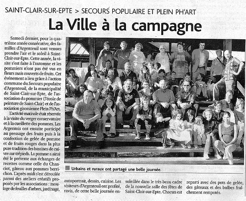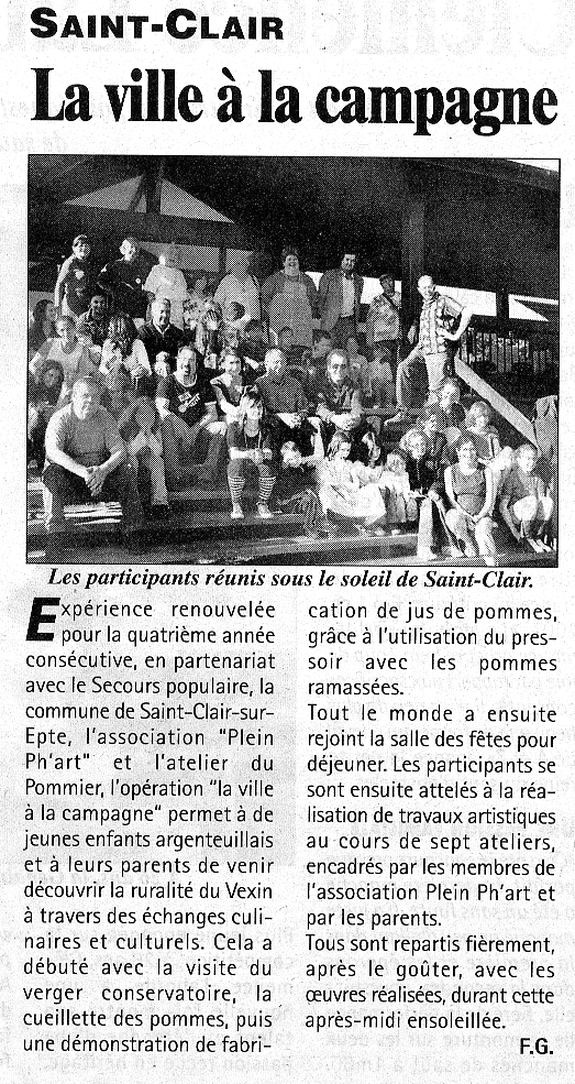 Expérience renouvelée pour la quatrième année consécutive, en partenariat avec le Secours populaire, la commune de Saint-Clair-sur-Epte, l’association «  Plein Ph’Art » et  l’atelier du Pommier, l’opération «  la ville à la campagne » permet à de jeunes enfants argenteuillais et à leurs parents de venir découvrir la ruralité du Vexin à travers des échanges culinaires et culturels. Cela a débuté avec la visite du verger conservatoire, la cueillette des pommes, puis une démonstration de fabrication de jus de pommes, grâce à l’utilisation du pressoir avec les pommes ramassées.