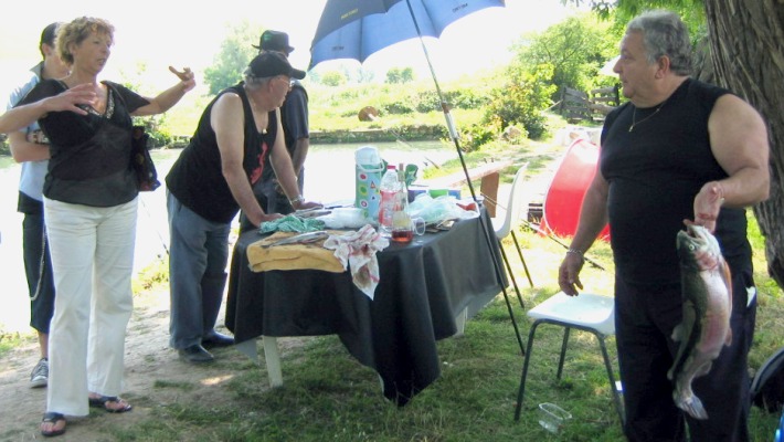 Sylvie sera la plus hardie à aborder les pécheurs avec décontraction et jovialerie, lors de nos séances de peinture et nos barbecues, en juin 2006. Nous y avions été très bien accueillis, et nous y reviendrons avec plaisir ! |
