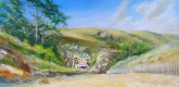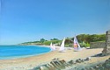 Du 1 au 18 juillet 2004, nous étions à Tibain, commune de Locmaria. Au contraire de l'année dernière, où ma palette se satura de bleu presque méditérranéen, cette année plutôt grisaille, bruine, vent... j'ai quand même pas mal travaillé sous le parapluie, aux bord des routes, et mon point de chute favori, vers les 19h, était le café et l'église de Locmaria, celle-ci très insolite avec son palmier, son toit en poivrière, son ambiance espagnole ! Les touristes planqués dans leurs logis, je rencontre avec plaisir les vrais belle-ilois, en vélo, à pied, à cheval... et aux comptoirs... |