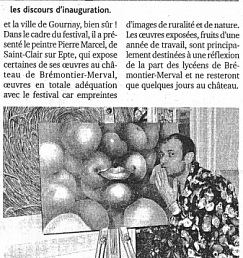 Pommes et balles de paille (...) le peintre Pierre Marcel, de Saint-Clair-sur-Epte, expose certaines de ses œuvres au château de Brémontier Merval, œuvres en totale adéquation avec le festival car empreintes d'images de ruralité et de nature. Les œuvres exposées, fruit d'une année de travail, sont principalement destinées à une reflexion de la part des lycéens de Brémontier-Merval ...(...) |