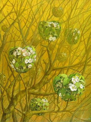 If ever there was a painting which shows Magritte's influence on me, this is it. I painted this piece under the flowering apple tree in the yard behind my studio, an umbrella protecting me from the wind gusts. The apple blossoms literally blossomed before my eyes. In no time at all, little apple buds appeared. A few short weeks later, baring branches were the harbinger of the nearing harvest. In this painting, the 4 seasons are summer-ized.