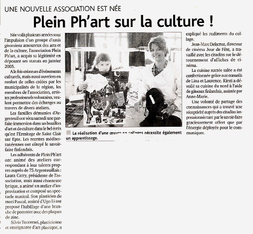 échanges aux travers de divers ateliers. Les adhérents de Plein Ph’Art ont animé des ateliers correspondants à leurs talents auprès de 75 argenteuillais : Laura Catry, présidente de l’association, mais aussi chanteuse lyrique a animé in atelier d’improvisation et composé un spectacle musical. Son plasticien de mari, Pascal, assisté d’ Ugo Li pnt proposé l’habillage d’une branche de pommier avec des plaques de zinc. Silvia Tuccimei, plasticienne et enseignante d’art plastique, a expliqué les rudiments du collage. Jean Marc delacruz, directeur du cinéma Jour de Fête, a travaillé avec les citadins sur le détournement d’affiches de cinéma. La cuisine sucrée salée a été confectionnée grâce aux conseils de Lian et laurence, Kisrti a dévoilé sa cuisine du nord à l’aide de gâteaux finlandais, assistée par Anne-Marie. Une volonté de partage des connaissances qui a trouvé une réceptivité auprès des citadins impressionnés tant par le savoir-faire gracieusement offert que par l’énergie déployée pour le communiquer. |